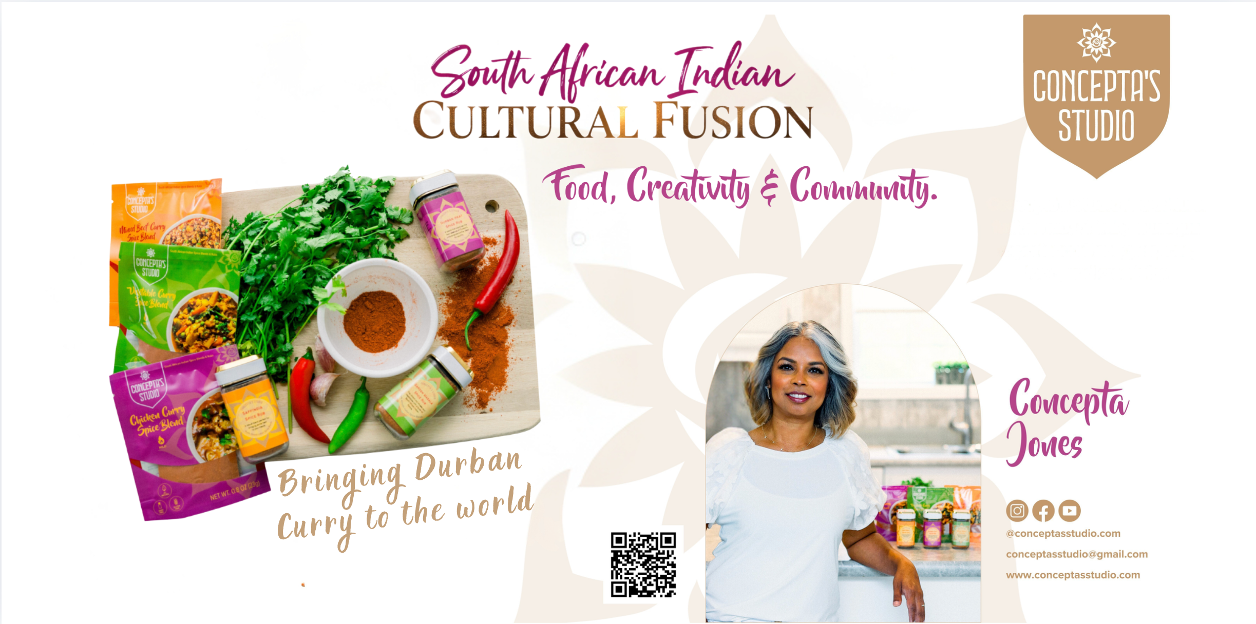 Come visit Concepta's Studio booth and explore our unique South African Indian spice blends, rubs, and more. Discover our cultural experiences, cooking workshops, and special retail items, including merchandise like logo t-shirts and aprons. Don't miss out on the flavors and fun – see you there!