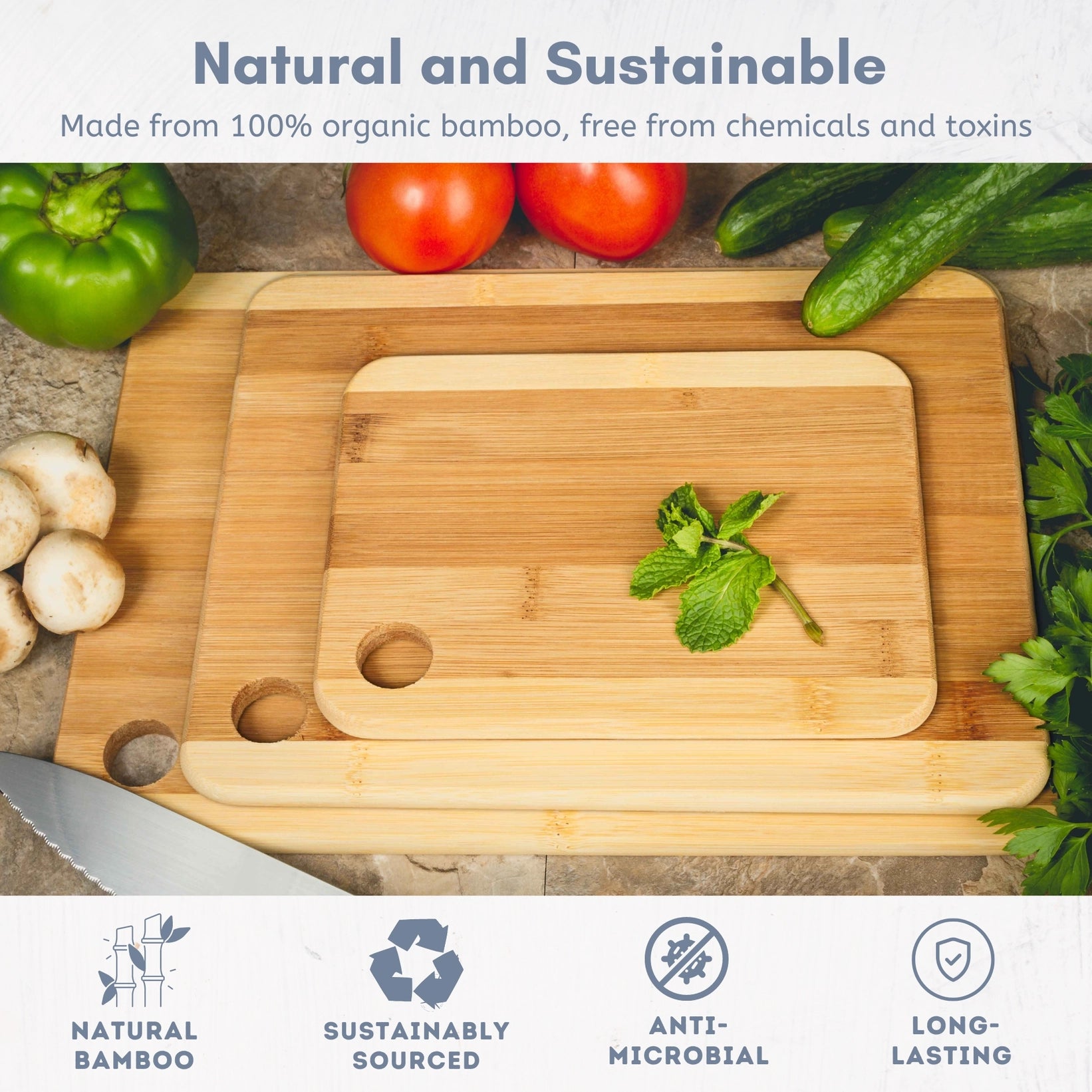 KEY FEATURES The smooth bamboo wood doesn't dull your knives and feels easy to cut on. Also, there will be no scratches and marks on the board. Your workspace will be clean and well-organized even during the busiest cooking moments. The bamboo boards are processed under high temperatures and high pressure which makes the board the advantage of not cracking, not deforming, abrasion resistance, hardness, and good toughness.
