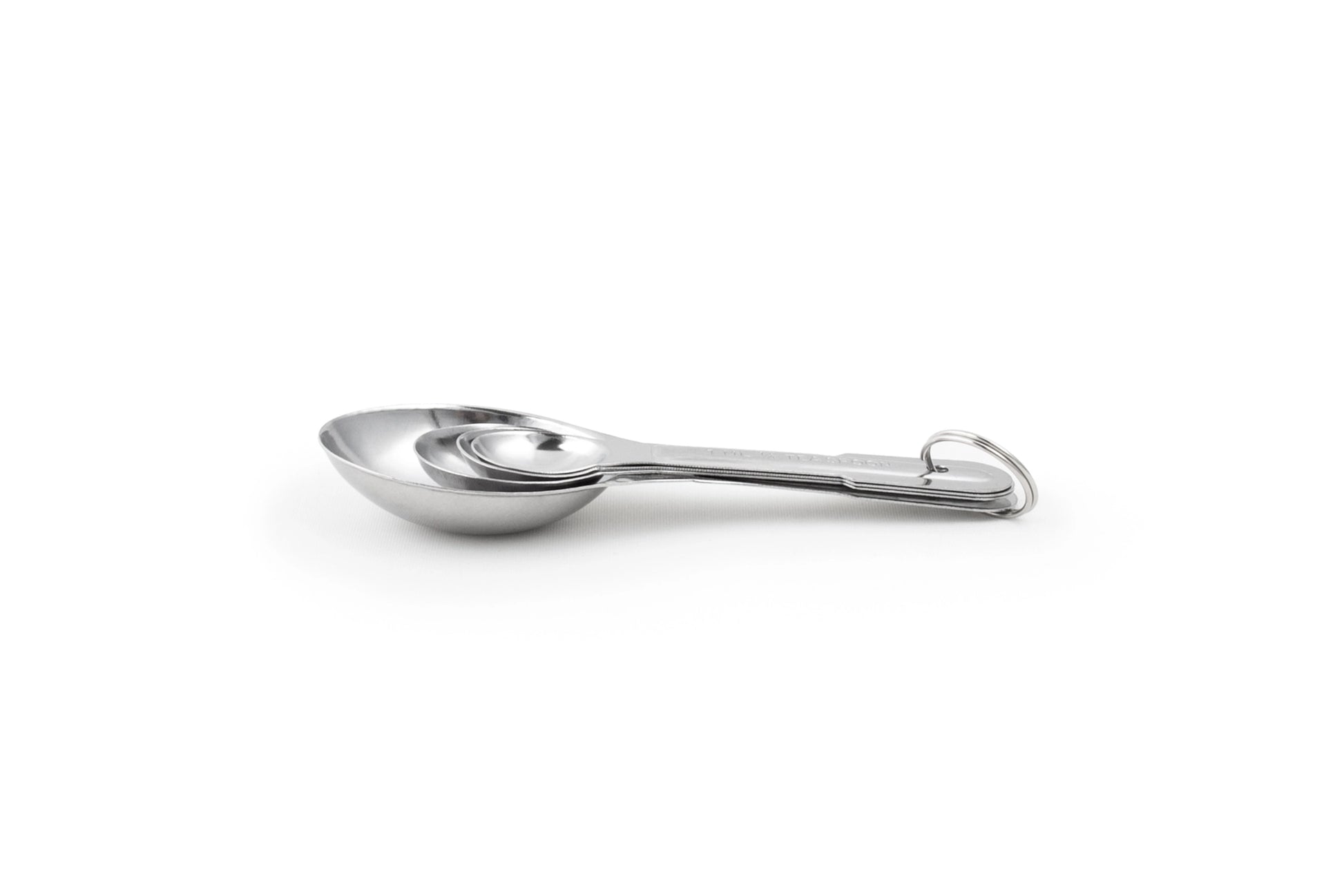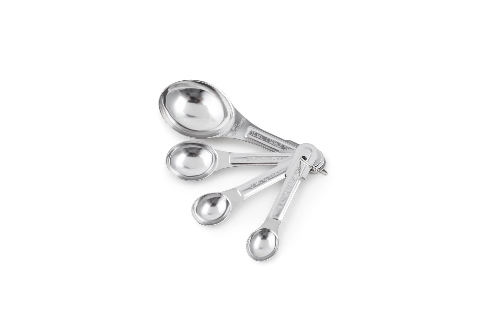 This stainless steel Measuring Spoon Set is an essential part of the cooking process. Included measurements are 1/4 tsp, 1/2 tsp, 1 tsp, 1 tbsp., which are engraved into the metal, so they won't wash off! The spoons in this set feature a wide, flat design for easy filling and hassle-free cleaning. The set is attached on a central ring and the spoons nest inside each other to save storage space.